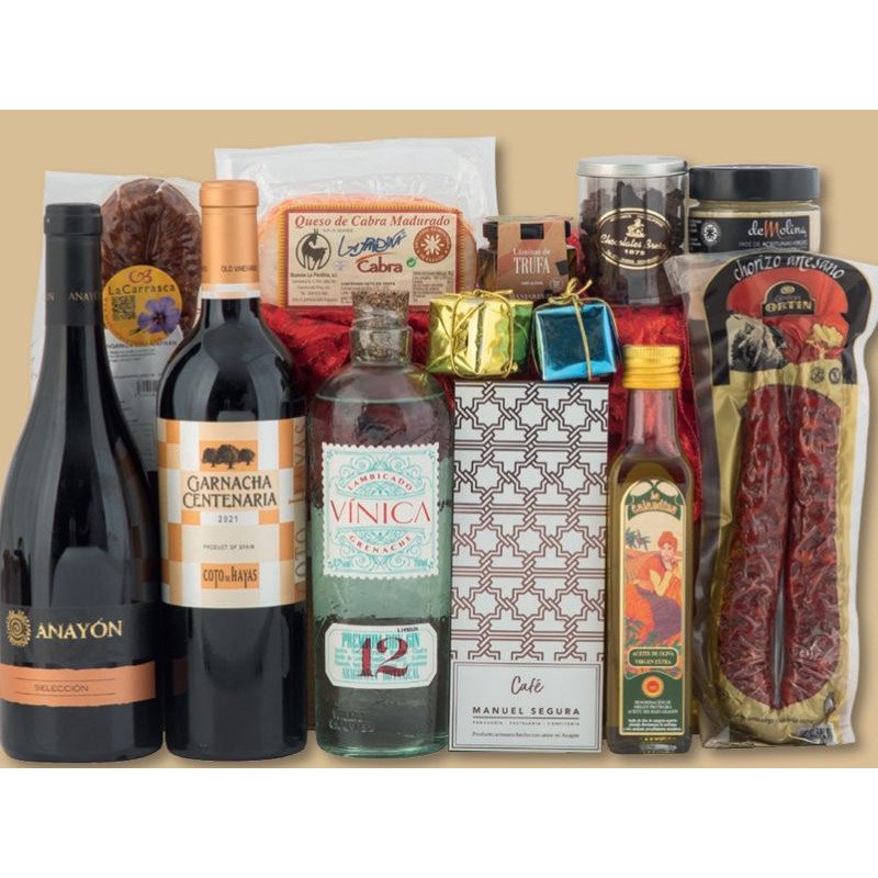 | 1 Botella 75 cl. Vino D.O. Cariñena Tinto “Selección” – Anayón | Tinto de alta gama con crianza en barrica, elaborado con uvas seleccionadas. Complejo, equilibrado y con final persistente: un vino para ocasiones especiales. |